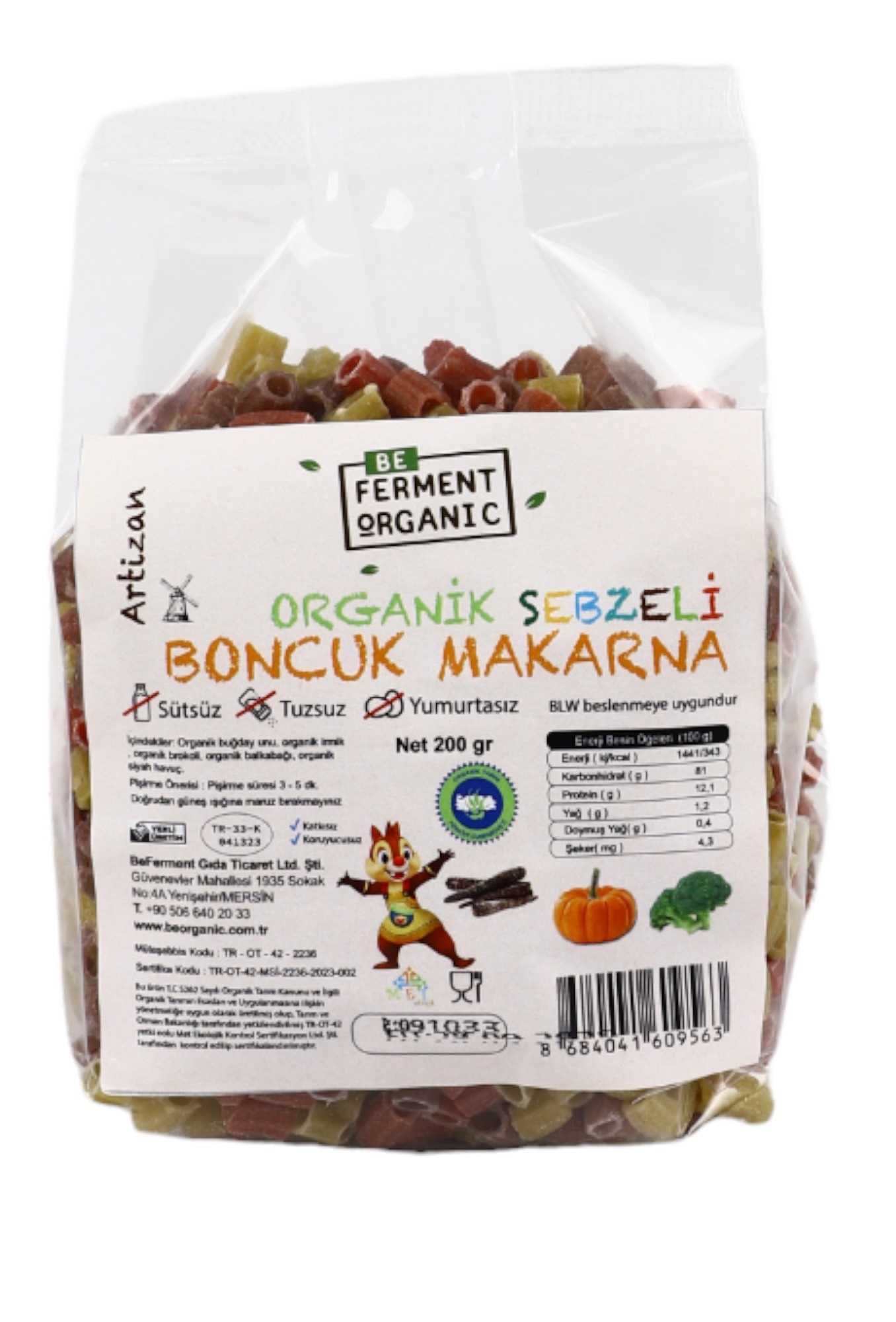 Beferment Organic Boncuk Makarna, organik sebzeler ve organik buğday unu ile hazırlanmış doğal bir üründür.