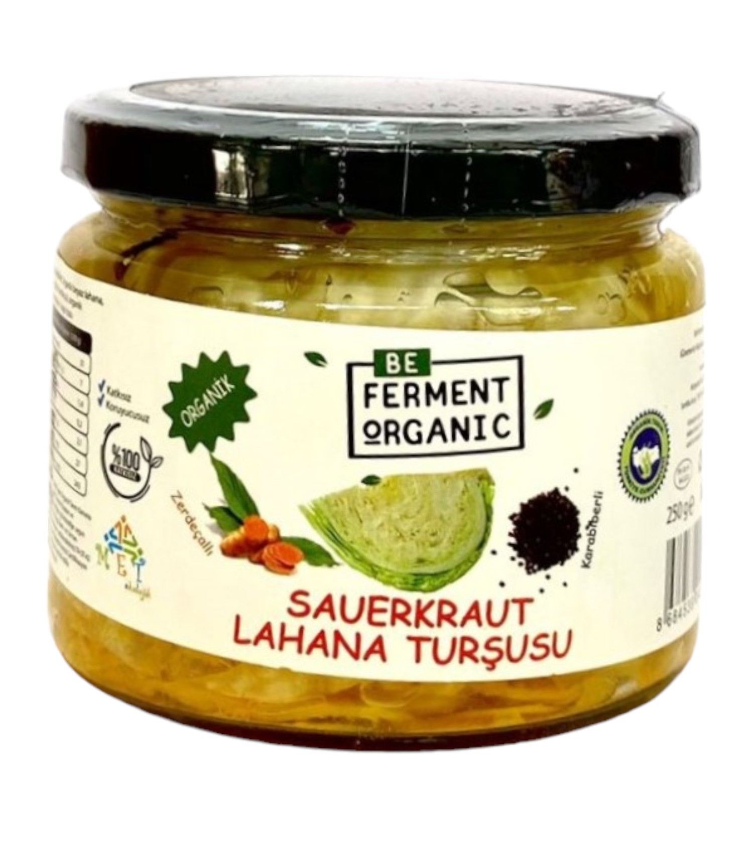 Beferment Organik Zerdeçallı Karabiberli Sauerkraut, geleneksel lakto-fermente yöntemiyle hazırlanmış, baharatlarla zenginleştirilmiş doğal bir lahana turşusudur. Organik beyaz lahana, kaya tuzu, organik zerdeçal ve organik karabiber kullanılarak üretilmiştir. Katkı maddesi ve koruyucu içermez.