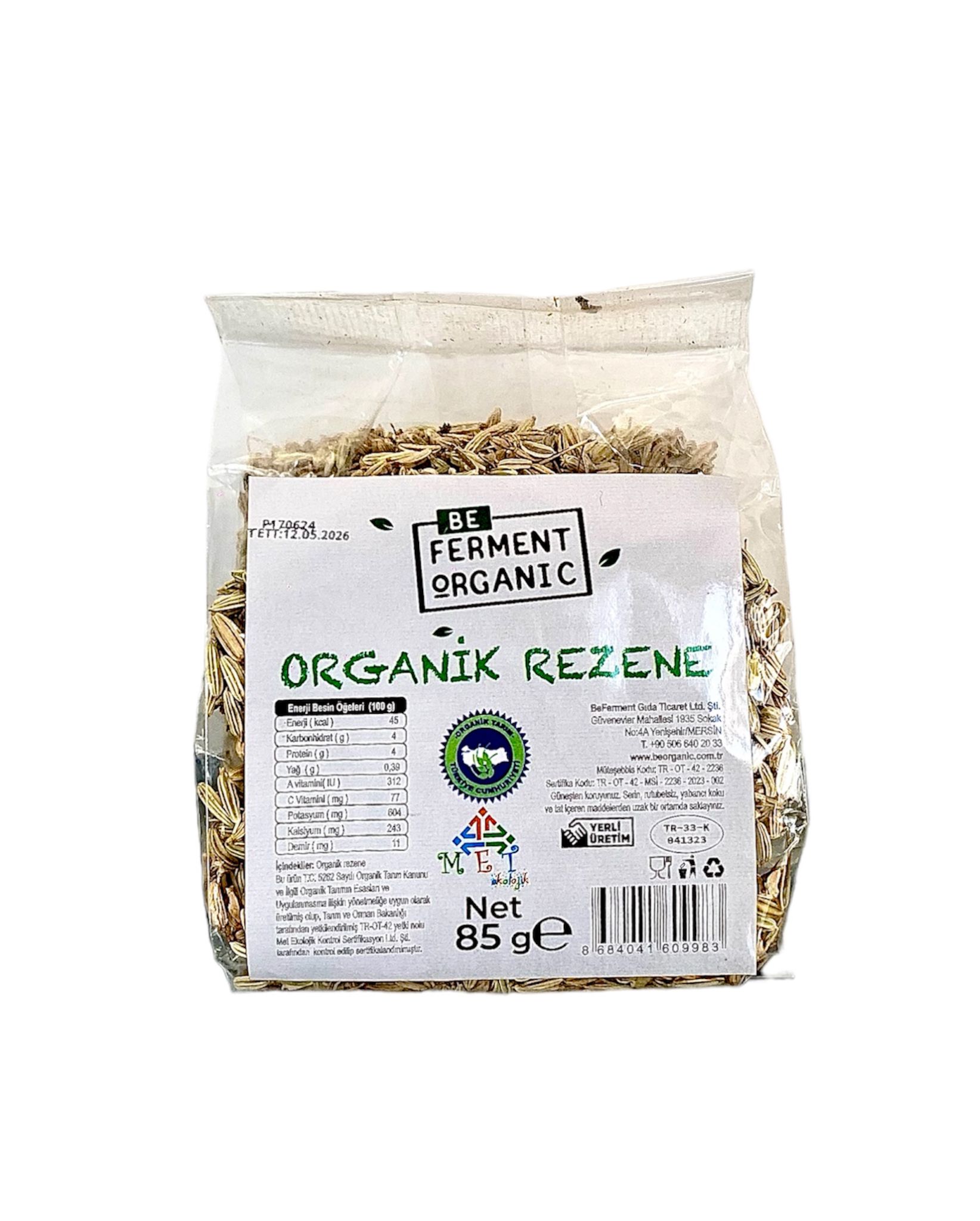 Beferment Organik Rezene, özenle seçilmiş rezene tohumlarından elde edilen doğal bir üründür. Hafif tatlı ve anason benzeri aromasıyla yemeklerde ve içeceklerde kullanılabilir.