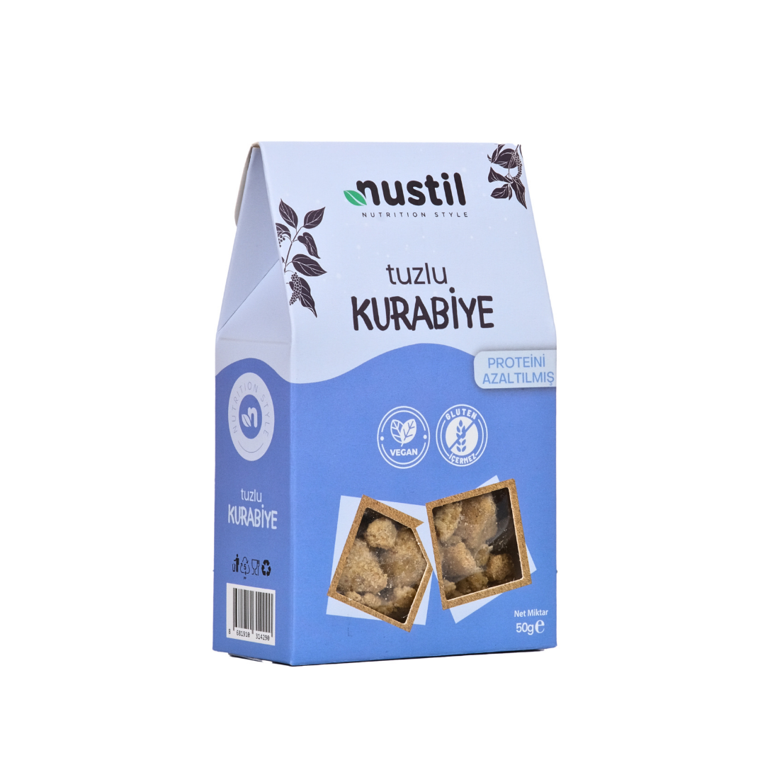 Nustil Glutensiz Düşük Protein Tuzlu Kurabiye, glutensiz ve vegan beslenenler için bir alternatiftir.